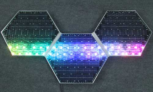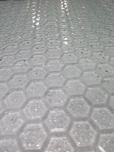 The Solar Roadways panels are made of tempered, safety glass.[1][2][6] The glass was chosen for its durability, strength, and hardness. The glass is textured to create traction for vehicles and pedestrians. The major difference between the panel’s glass and the asphalt roads is aesthetics. The hexagonal panels are a work of art that’ll make the roadways, patios, driveways, and sidewalks more beautiful. The hexagonal shape was chosen for its extra stability to wear as well as its flexibility in installing curves, hills, and odd-shaped installations.